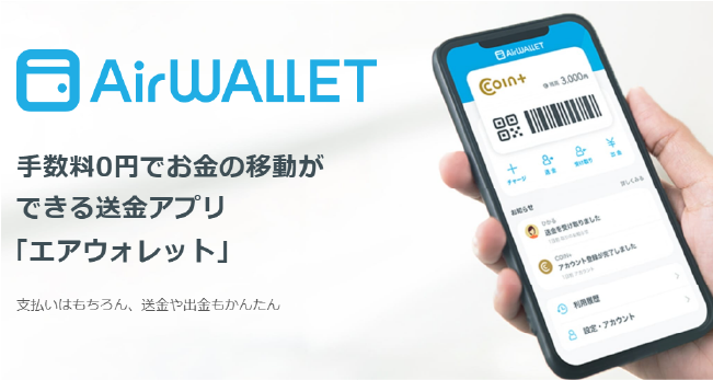 エアウォレットとは、「COIN+」を利用したチャージ・支払い・送金・出金ができるアプリです。