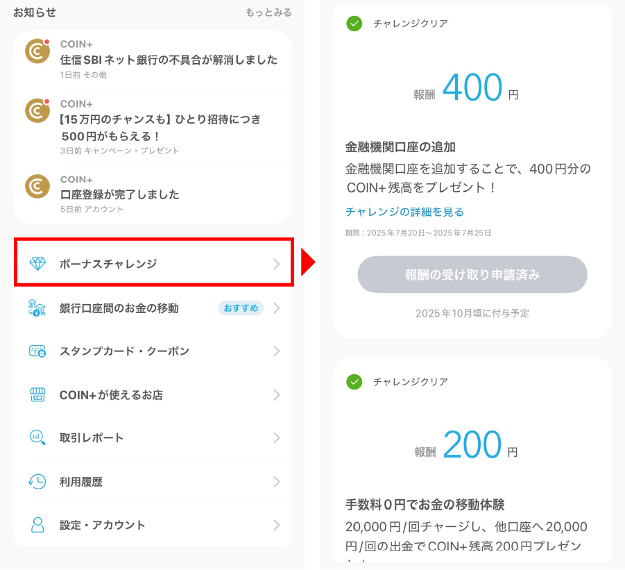 こちらは常設ではないのかもしれませんが、筆者がエアウォレットを始めた時には、約1000円分くらいのボーナスチャレンジがありました。確認方法は以下