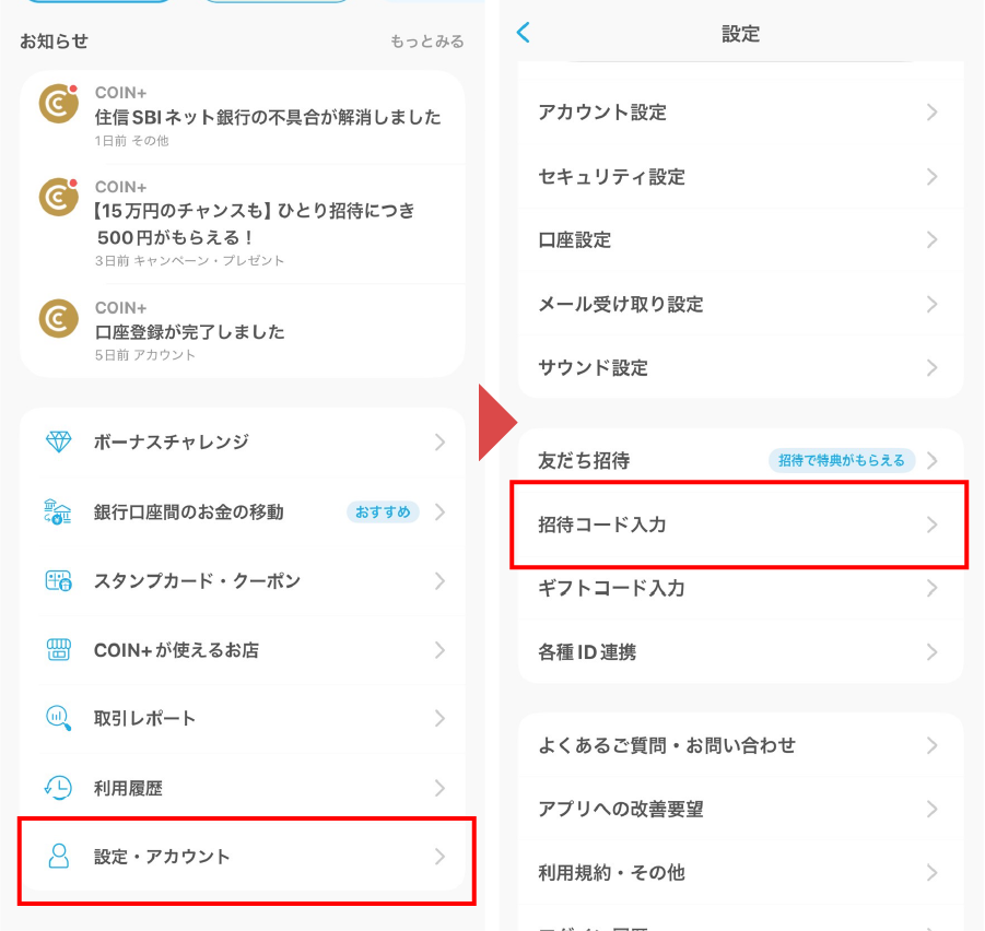 自分の招待コードは、設定・アカウント>友達招待 から確認できます。特典を貰うには必ず招待プログラムへのエントリーが必要なので、招待をする際は忘れずに行いましょう。招待上限は月100人のことが多いです。
