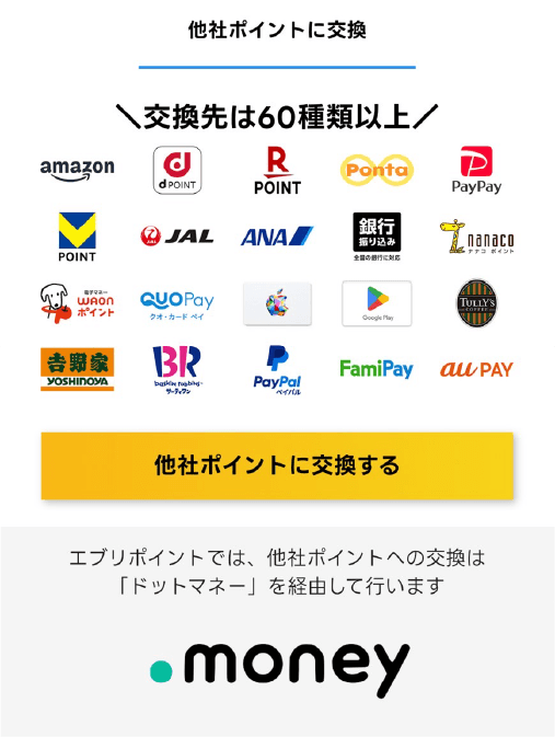 EveryPoint(エブリィポイント)は100P=約1円のレートで、300円分から交換ができます。交換先には、ドットマネーを採用しており、現金化も可能です。