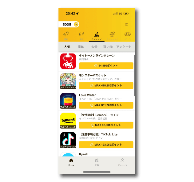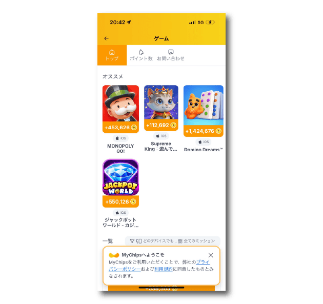 指定のアプリゲームを遊ぶことでポイントが貰えます。ミッションにもアプリゲームは存在するので、ゲームで貯めたい方はどちらもチェックしていきましょう。