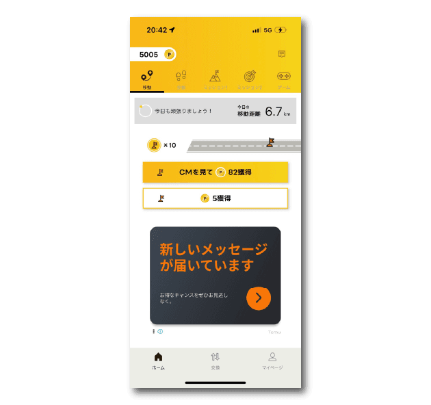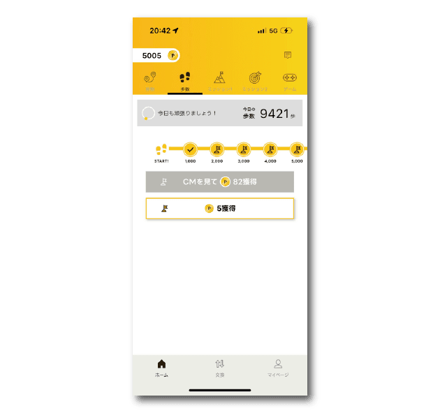 400歩ごとに広告視聴で82Pか視聴せずに5Pを受け取れます。