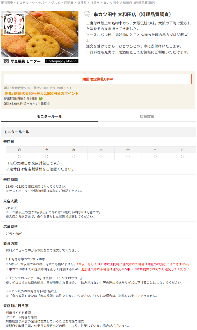 案件の中を覗くと細かい条件が記載されています。この案件だと来店してご飯を食べて写真を撮ってくるのが主な条件です。これだけで最大2500円分のポイントが手に入ってしまいます。