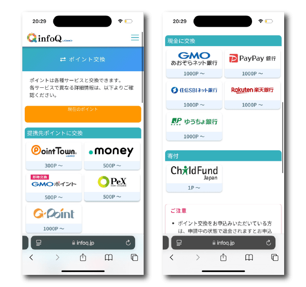 infoQは、現金、ギフト券、各種ポイントに交換が可能です。交換レートも1ポイント=1円なのでかなり破格です。