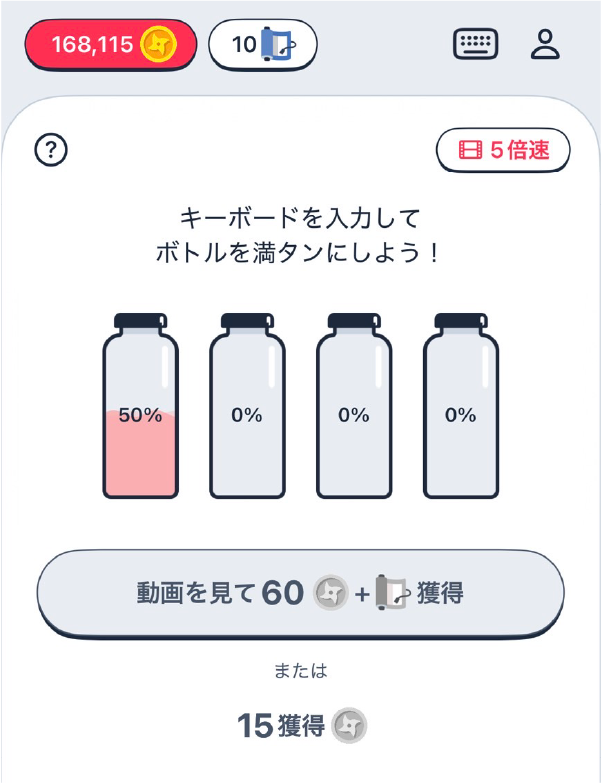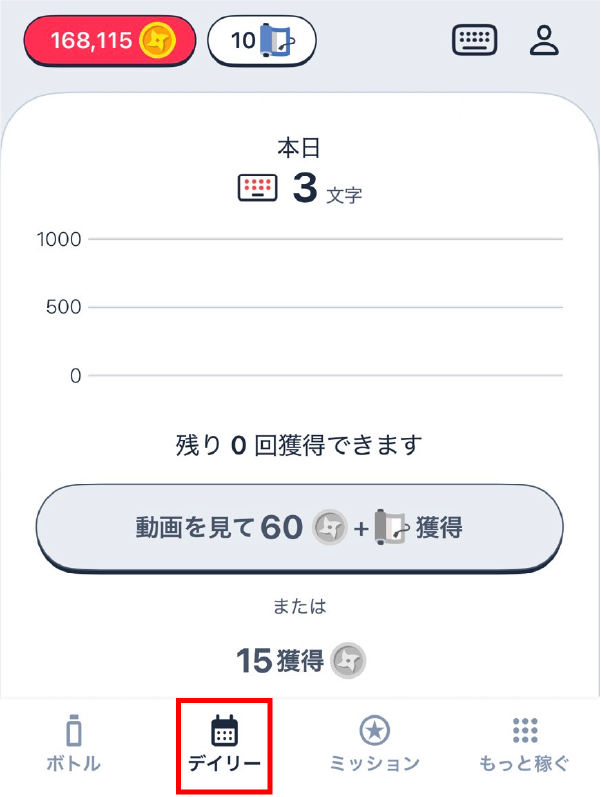 1000文字入力する毎に、タンクが一本溜まります。溜まったボトルは、広告を見て60マイルか、広告を見ずに15マイルと交換できます。おそらく1日の上限はありません。