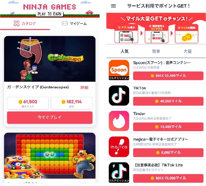 ニンジャマイルズは以下の機能でポイントを貯めることができます。