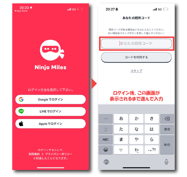 ニンジャマイルズには招待コードの制度があります。インストール時に以下の手順を行うことでマイルを得できますので必ず行いましょう。