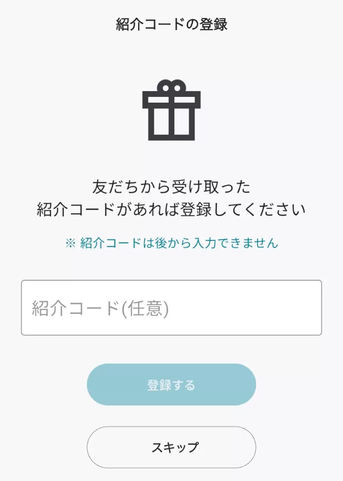 最終画面で紹介コードを求められます。ここで「QCY8V3UN」を入力すればOKです。ここで入れ忘れると紹介特典が貰えないので改めて注意!