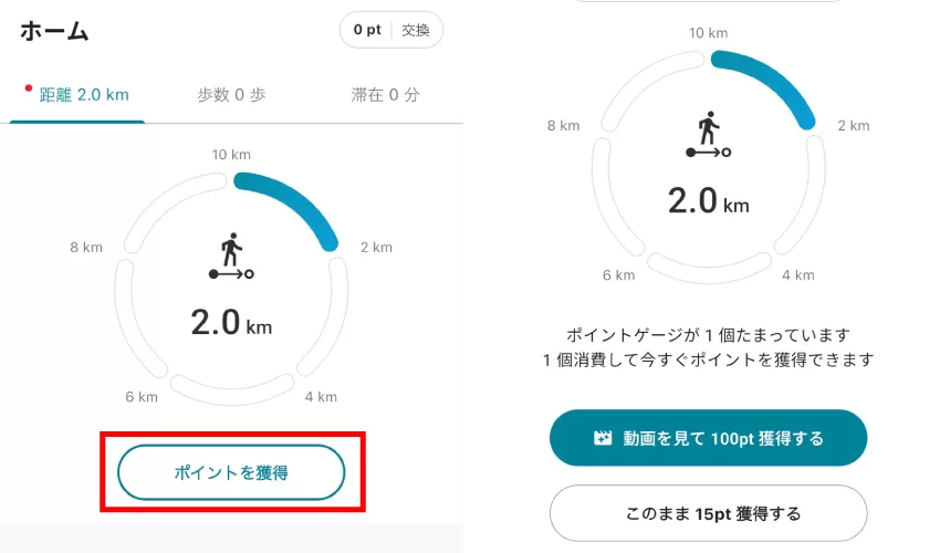 2km移動するごとに1ゲージ獲得できます。ゲージを消費して動画を視聴して100ポイントか、そのまま15ポイントを受け取れます。2kmちょっと長いな、、とも思ったのですが、使っている感じ、移動手段を問わなそう(電車、タクシーOK)なのでかなり爆速で貯まります。