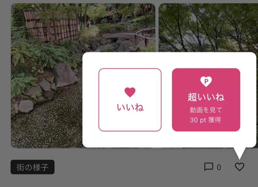 他の人の投稿にはCMを見て「超いいね」ができお互いに30ポイントを獲得することができます。一応、位置情報に基づいた投稿になるので個人が特定できてしまうような投稿はしないように気を付けましょう。