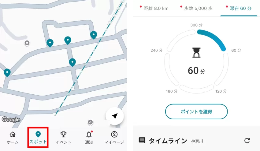 他アプリのチェックインとは違って即時ポイントが貰えるわけではなく、滞在から60分が経過するごとにCM視聴で100ポイント貰えるゲージが貯まります。滞在している限りほぼ無限にポイントを獲得できるのが強みですが、職場や自宅がスポット内にない方には少し厳しい機能です。あった人は超ラッキー。