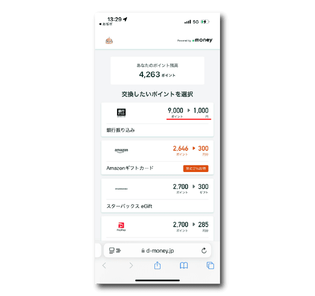例えば現金振り込みですと、9000ポイント=1000円と他のポイ活アプリに比べてかなり交換率が良いです。(他社だとよくて10000ポイント、大体は11000ポイントのイメージです。)