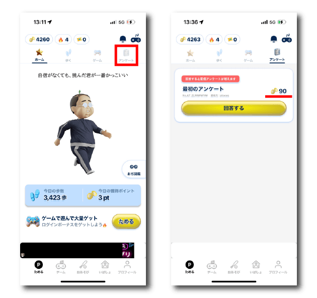 アンケート内容に応じてポイントが貰えます。最初のアンケートは設問数に対してかなり報酬が高額なので忘れずに回答しておきましょう。