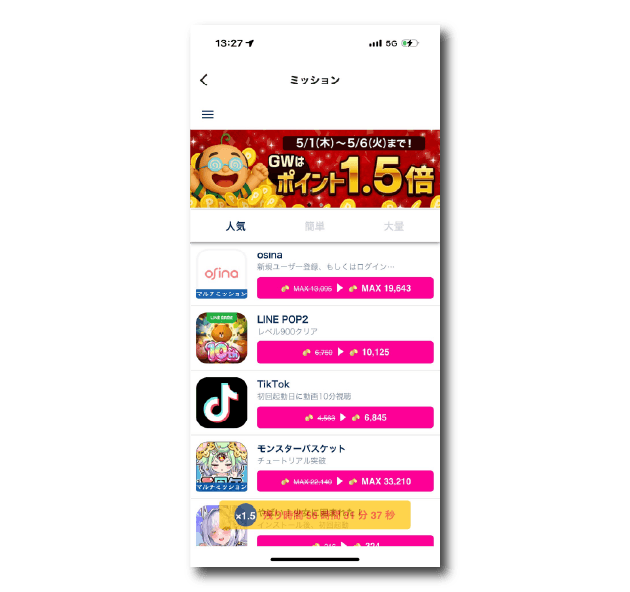 指定のアプリを遊ぶことで、段階に応じてポイントが貰えます。