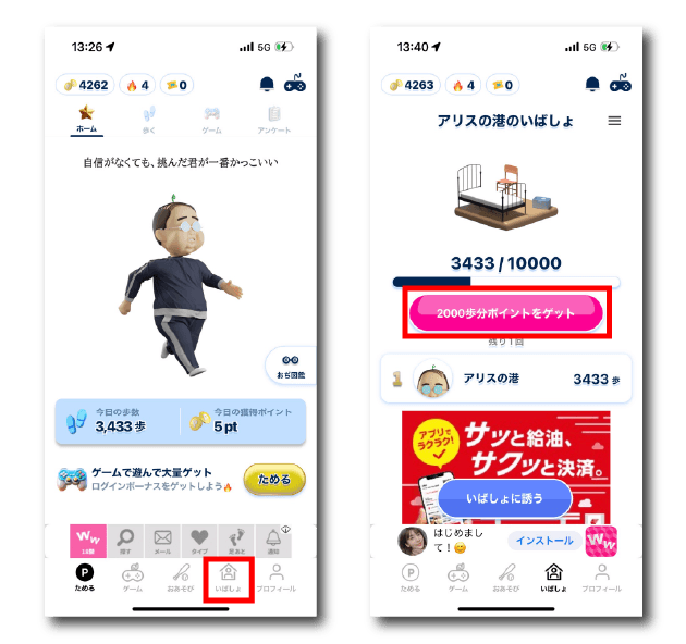 フレンドと歩数を共有できる機能です。2000歩ごとに広告視聴で5ポイント貰えます。