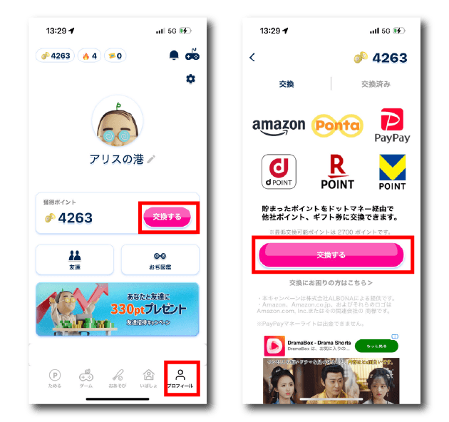 また、実際の交換はドットマネーに変換した後に行われるので、他のポイ活アプリと合算もできるようになりました。