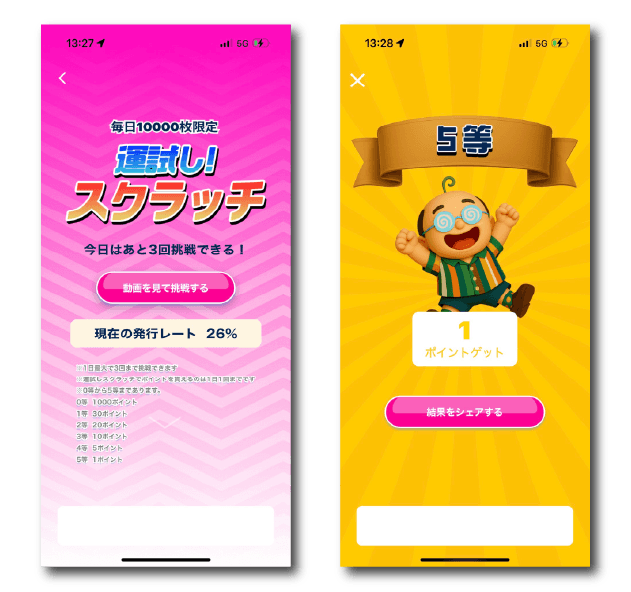 動画をみて一日3回までスクラッチができます。1等の額が大きいので時間があれば毎日引きたい機能です。