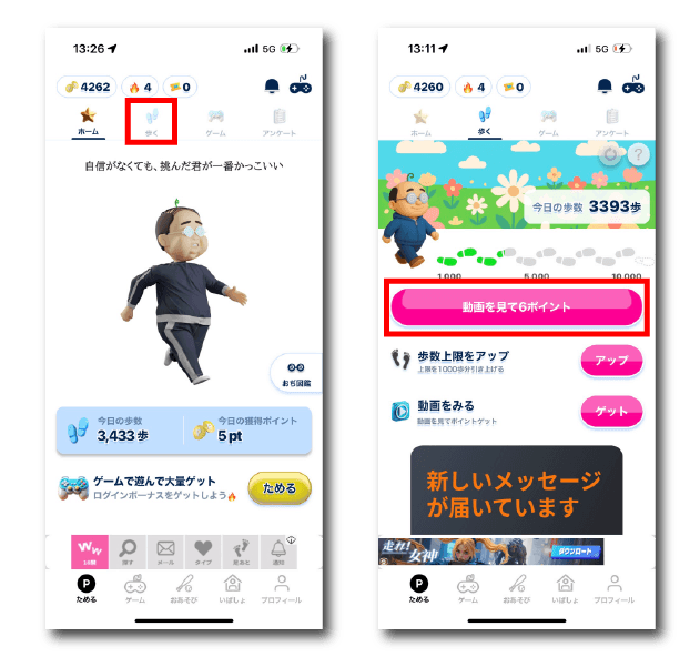 おぢポのメイン機能です。1000歩ごとに広告視聴で6ポイント、そのまま受け取りで2ポイント貰えます。