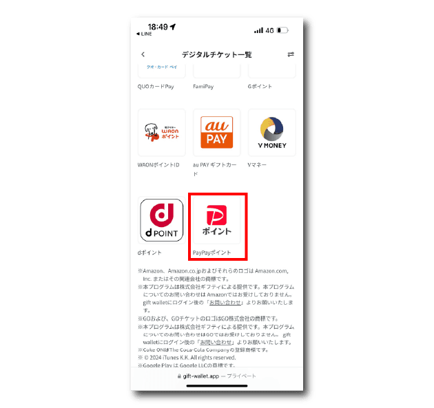 ここでどうしてもpaypayに交換したい人は「gift wallet」を選択してください。LINEを使って手軽にログインが可能です。