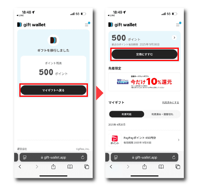 移行後は、マイギフトへ戻るを選択し、交換にすすむ。