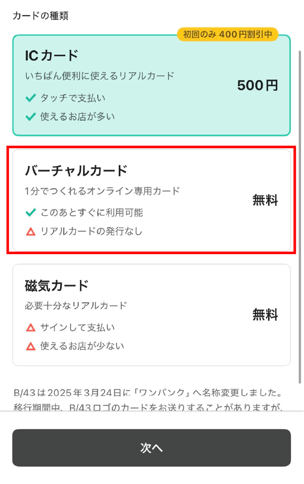 カードの種類を聞かれるけど、バーチャルカードでOK!