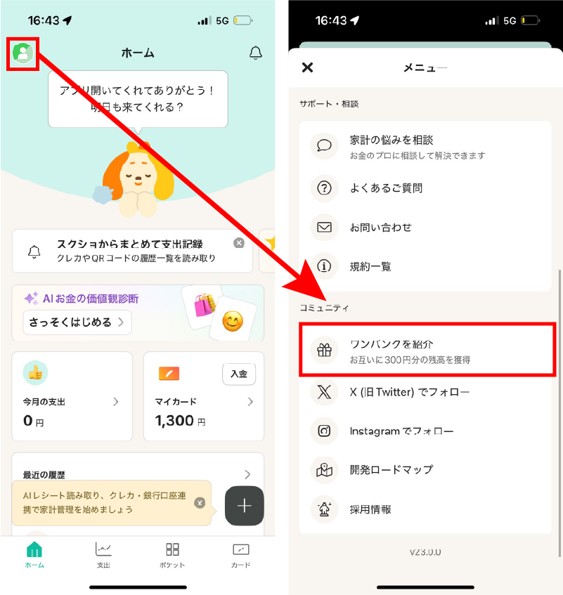 ワンバンクにはお友達紹介制度があります。招待コードを入力するか、紹介用のURLから初回登録することで300円を受け取ることができます。