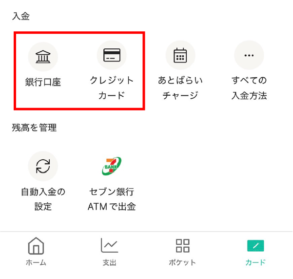 ホームから「クレジットカード」か「銀行口座」を選択しましょう。