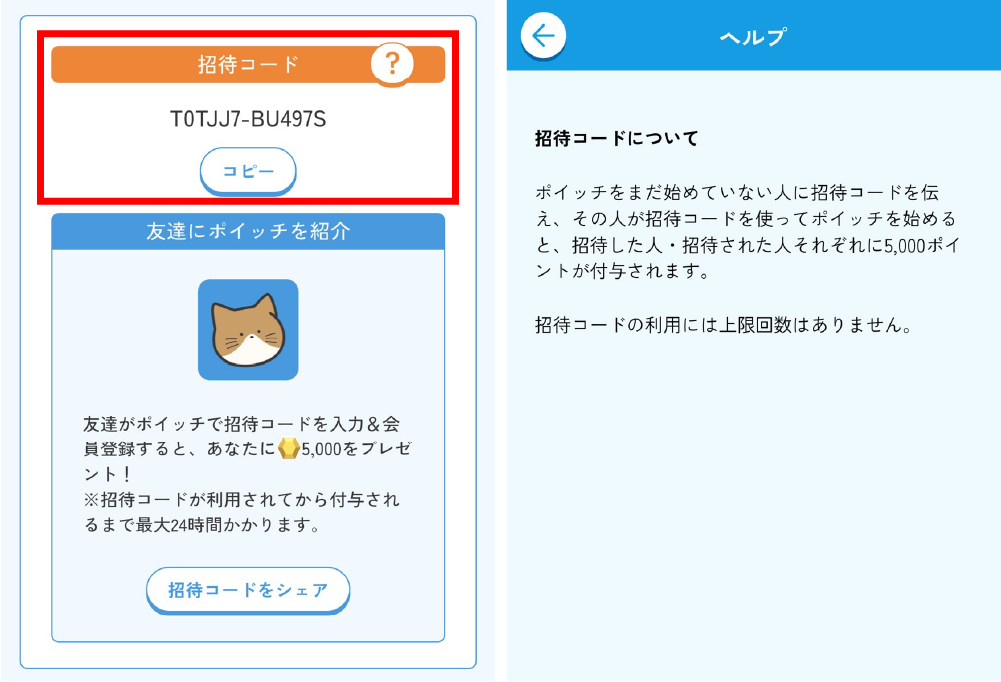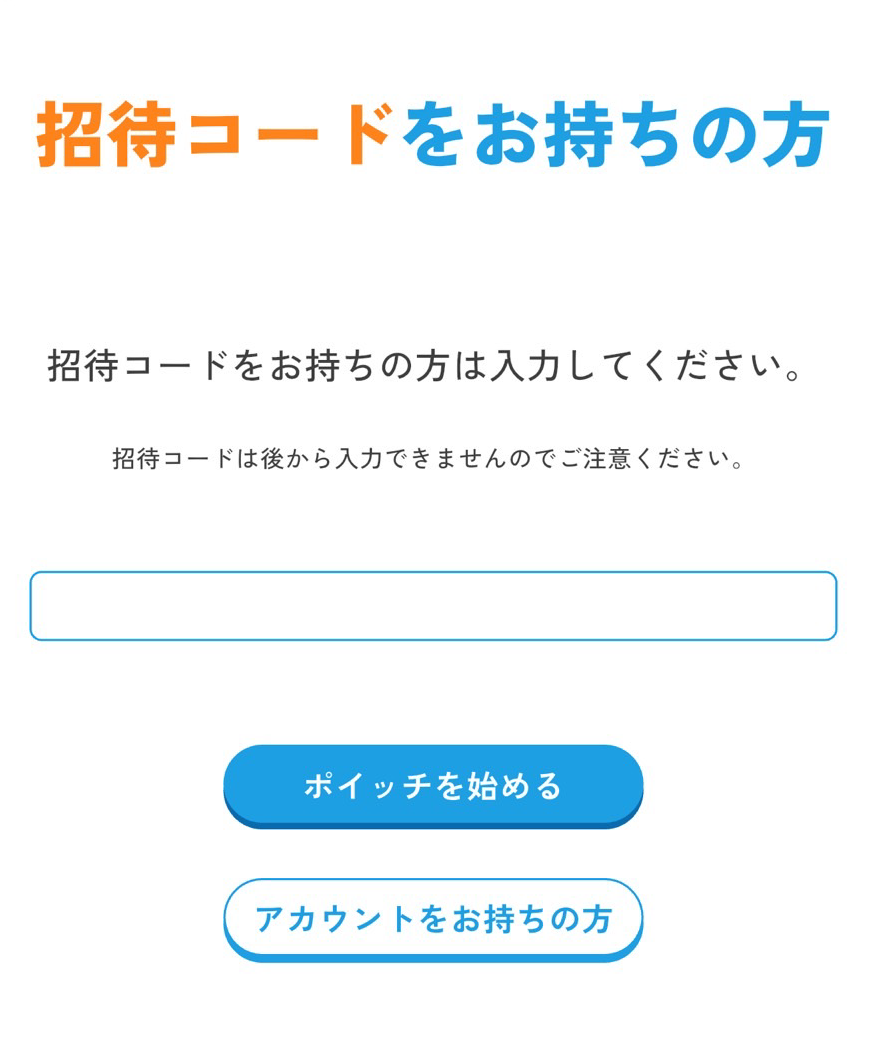 ポイッチにはお友達招待制度があります。以下の招待コードを入力することで、5000ポイント(約42円分)が貰えるので是非ご活用ください!なお、ポイッチはリリース時点でios版、Android版のどちらも存在しています。