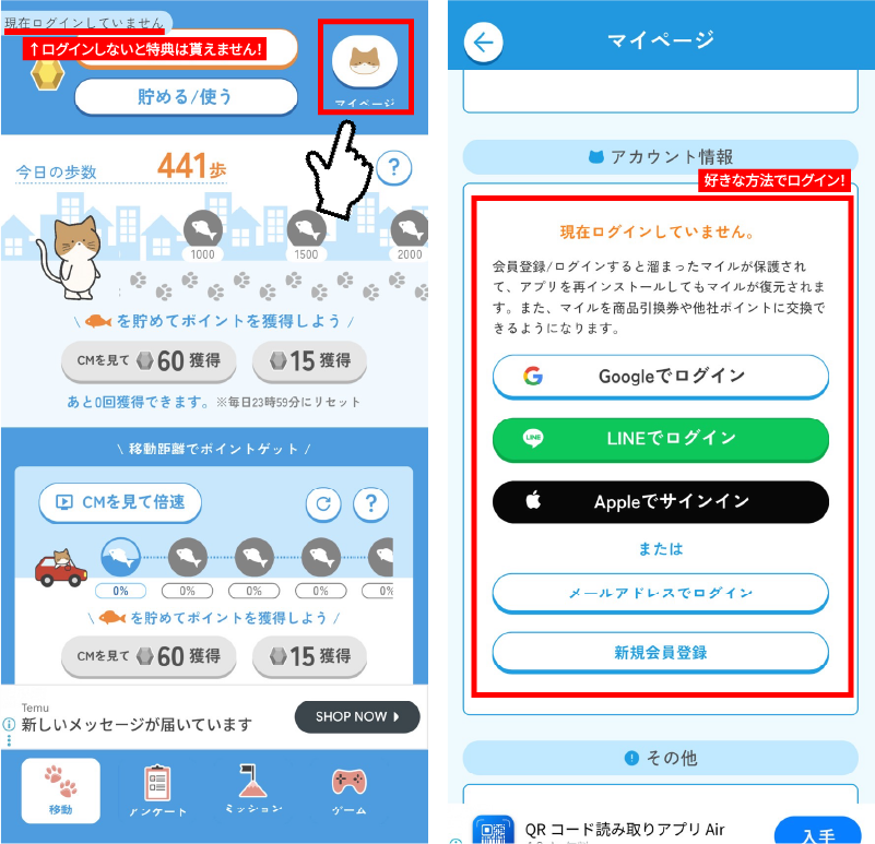ホーム画面に移動したらログインまで達成するとすぐに5000ポイントが貰えます。ログインはマイページから行いましょう。
