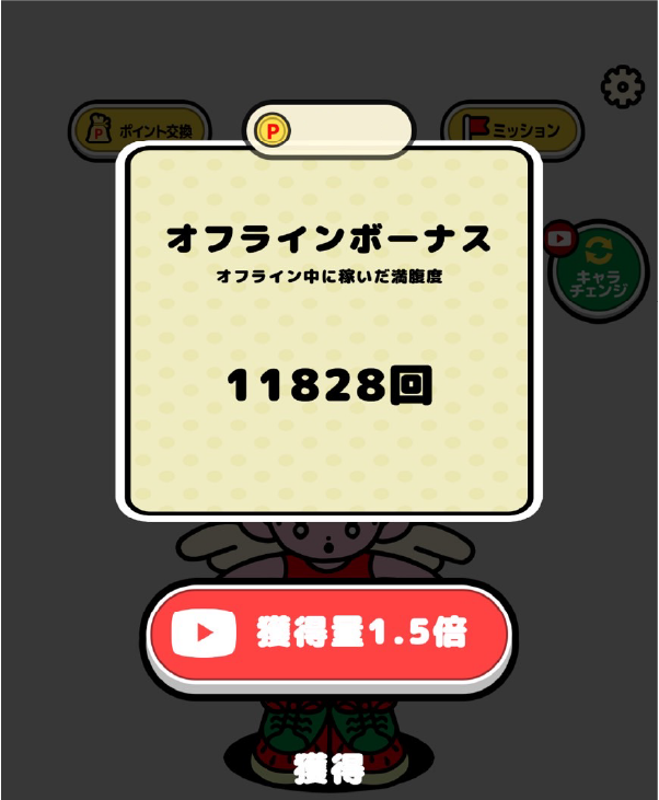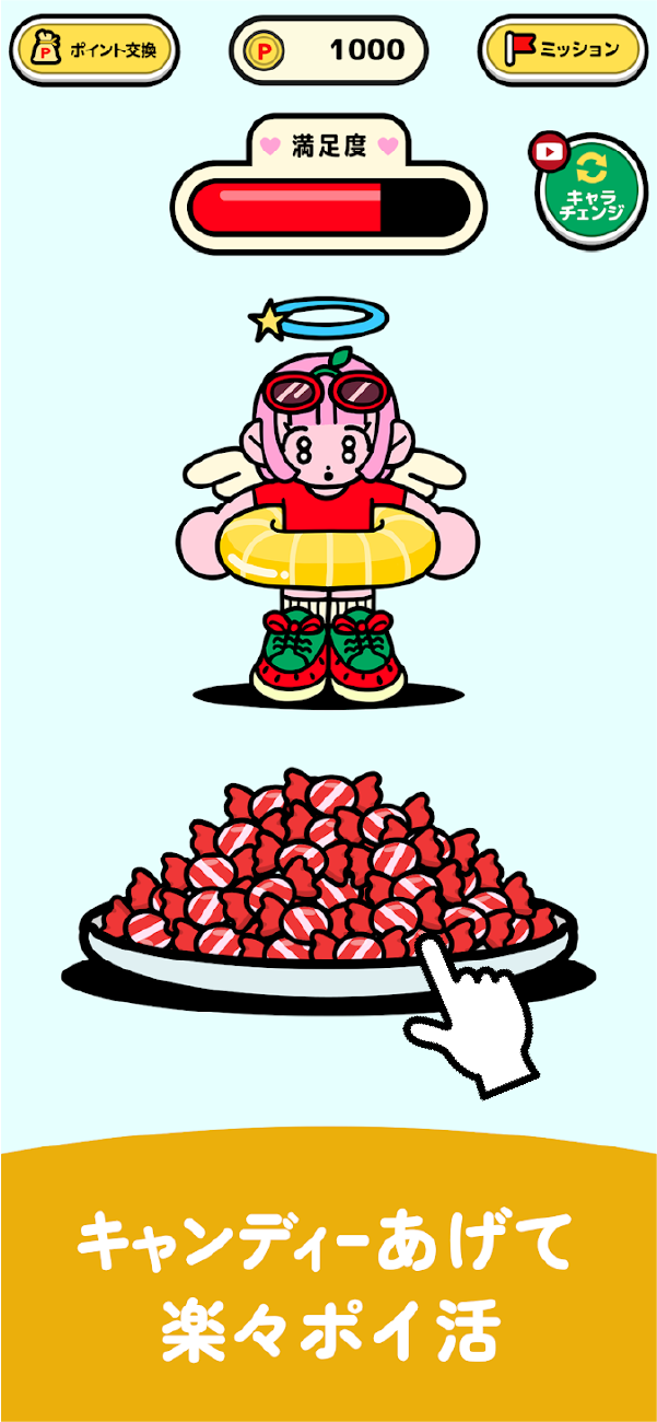 飴をタップすることでゲージを貯めることができ、満足度が100%になるごとにポイントが貰える仕組みでした。タップだけなのでテレビを見ながら貯めれるのが良いですね。