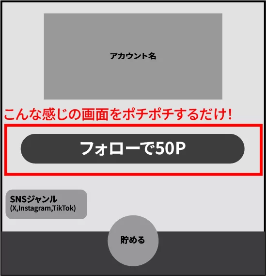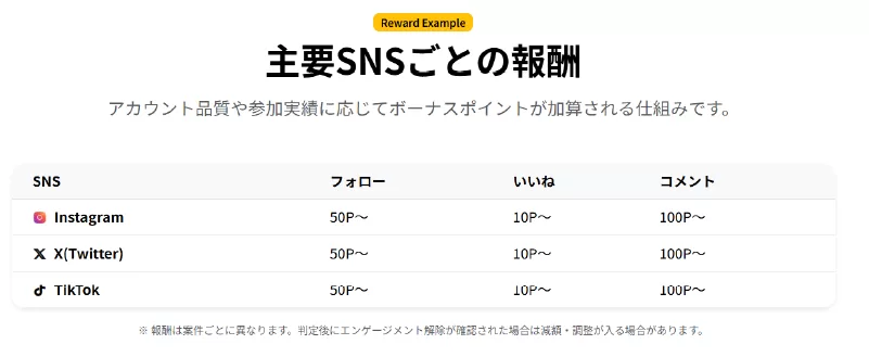 SNS(Xやインスタグラム、TikTokなど)の特定アクション(いいね、フォロー、コメントなど)に対してポイントが貰えるポイ活サービスです。2025年12月にリリースしたばかりの比較的新しいポイ活サービスで、運営会社はDreaw合同会社です。