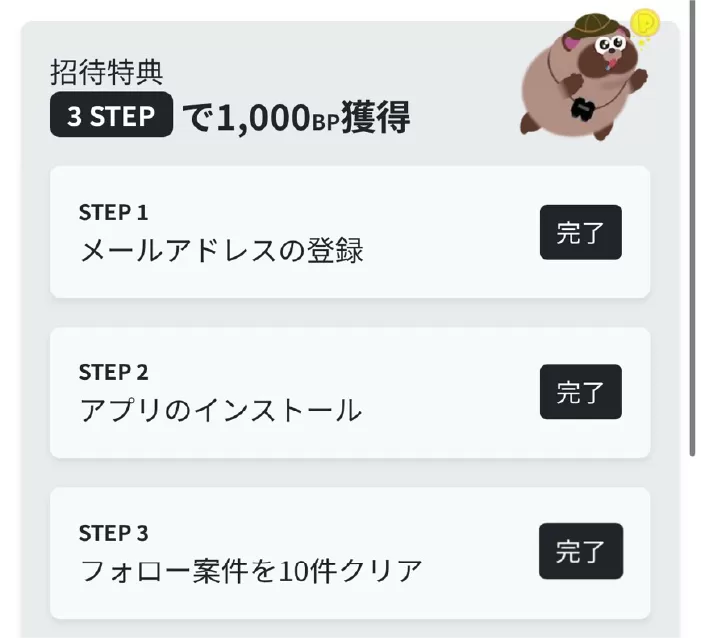 お友達紹介経由で100P貰うためには招待コードを利用して登録したあとに3つの手順が必要です。マイページから達成状況の確認ができます。