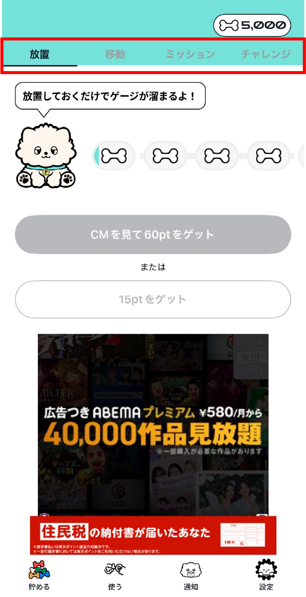 執筆時点では、「放置」「移動」「ミッション」「チャレンジ」の4つがありました。 「放置」の機能がある点が他のポイ活アプリとの差別化になっており、個人的には大変期待をしています。
