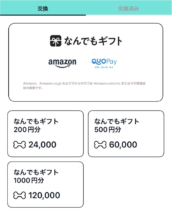 PoPomoviは交換先に「なんでもギフト」を採用しています。amazonギフトカードやQUOカードペイなどに交換できるギフトです。PayPay(ペイペイ)に交換ができるかは要調査。