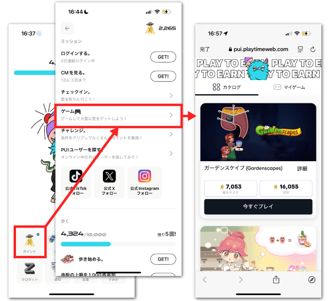 先ほどの「チャレンジ」のゲームアプリ特化版だと考えてもらえればOKです。 ゲームを遊ぶことで案件ごとに報酬がもらえます。PUIはSTEP式を多く採用しているので、手軽に始められるのが特徴です。