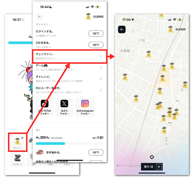 主要な建物や建造物が星マークとなって現れます。近づくことでチェックインでき、5ポイント獲得できます。1日10~20回までチェックイン可能です。