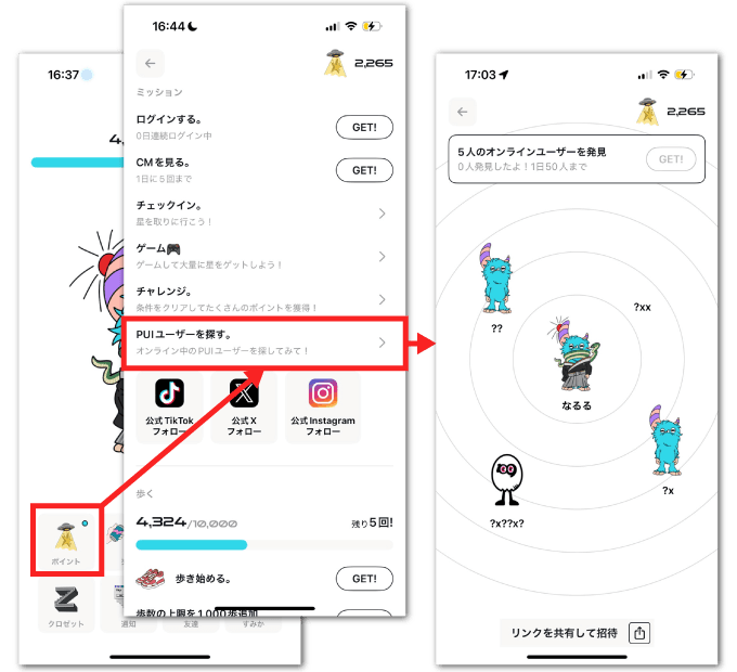 近くにいるPUIユーザーをタップすると2ポイント獲得できます。 残念ながら筆者はまだうまく活用できていません…💦