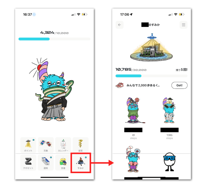 PUIには「すみか」という一種のフレンドチーム機能があります。 フレンドと協力して2000歩ごとに6ポイントが得られます。また、ランク機能もあるので、やり込み要素満載です。