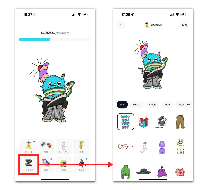 PUIはクロゼットで、服の着せ替えが可能です。個人的にこの昔で言うたまごっち感というか、一緒に生活している感がPUIの魅力だと思っています。 ※ちなみにこのキャラは「ドージ君」と言います。