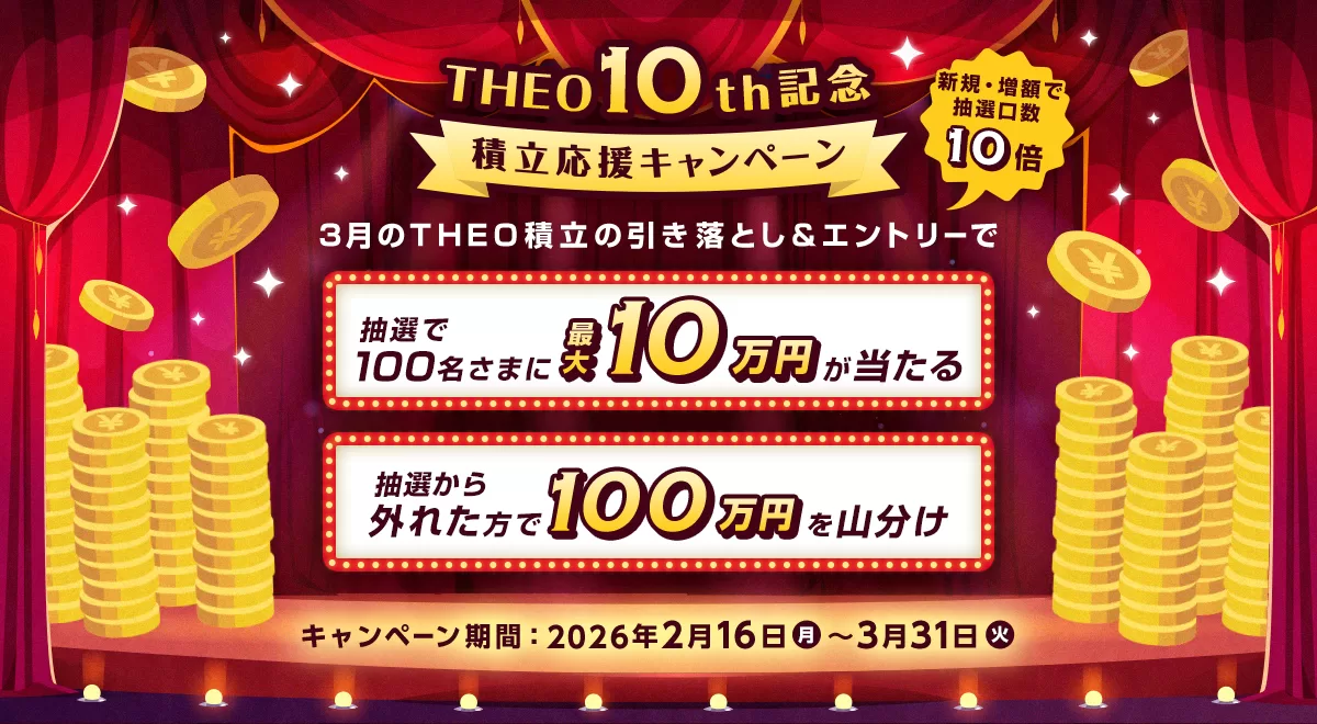 3月中にTHEO積立があった方を対象に抽選で最大10万円。