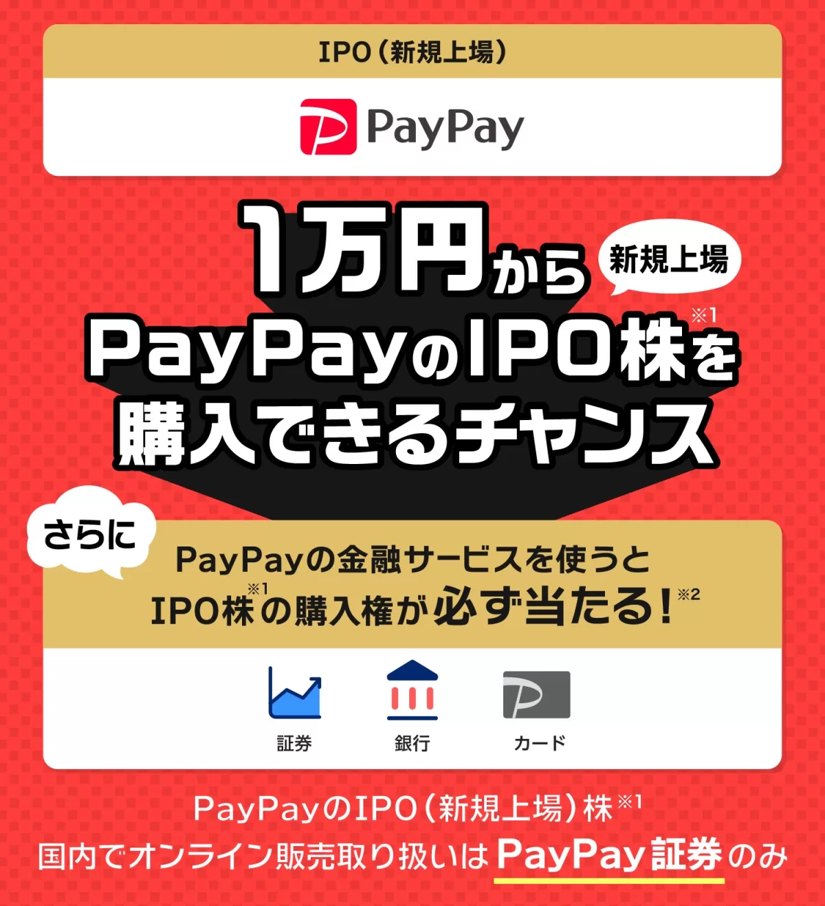 【PayPay証券】【PayPay銀行】【PayPayカード】を利用するとPayPayのIPO株が必ず当たるキャンペーンです。IPOの勝率はとてつもなく高いのでしっかり貰っておきましょう!