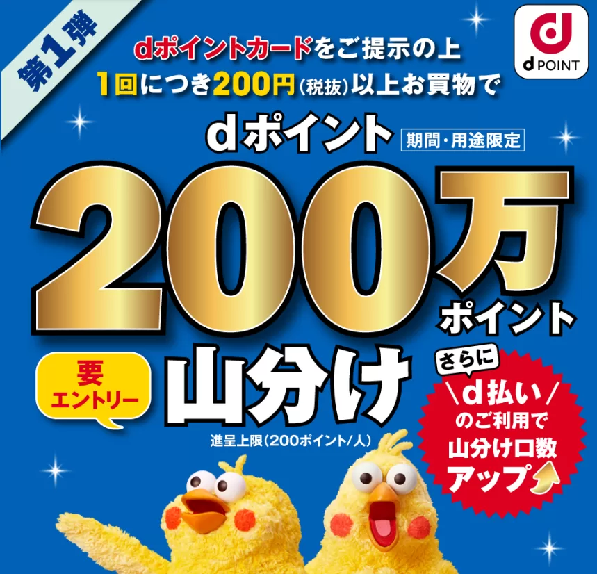 ローソンでdポイントカード掲示+200円以上のお買い物で200万ポイント山分け