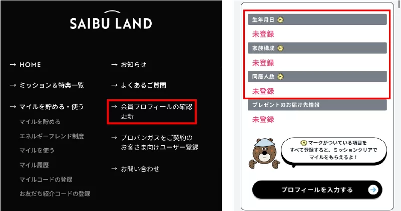 再びフッタ―から「会員プロフィールの確認・更新」を選択し、未入力になっている会員情報を登録しましょう。これで200マイル。