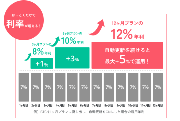 自動更新設定をONにしておくと、初めに設定した貸出期間を満了しても自動的に次の貸出期間に移行します。(1→3→6→12カ月)自動更新でも貰える利率はプラスしてくれます。