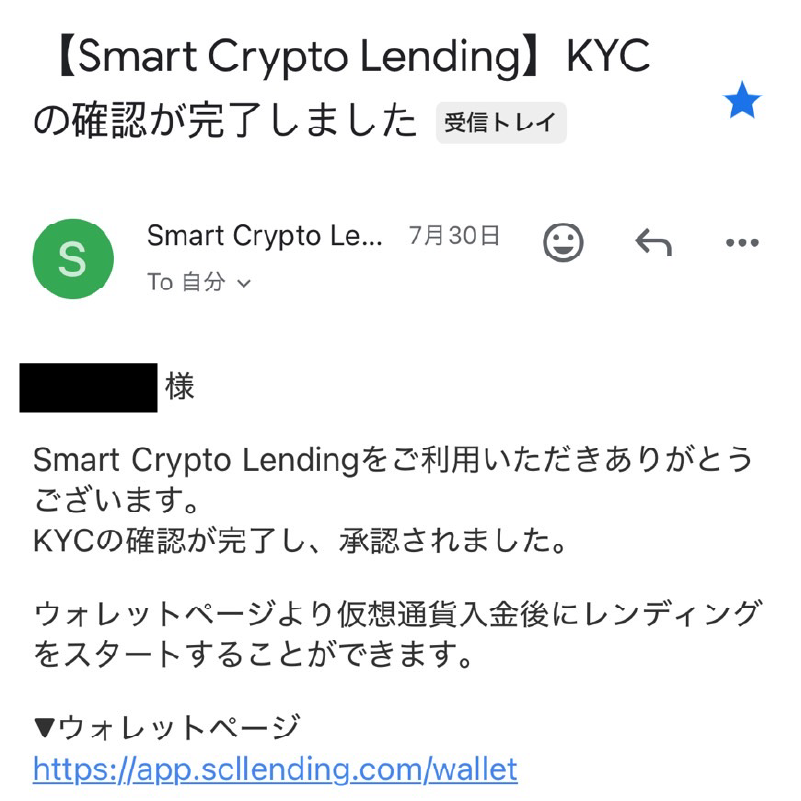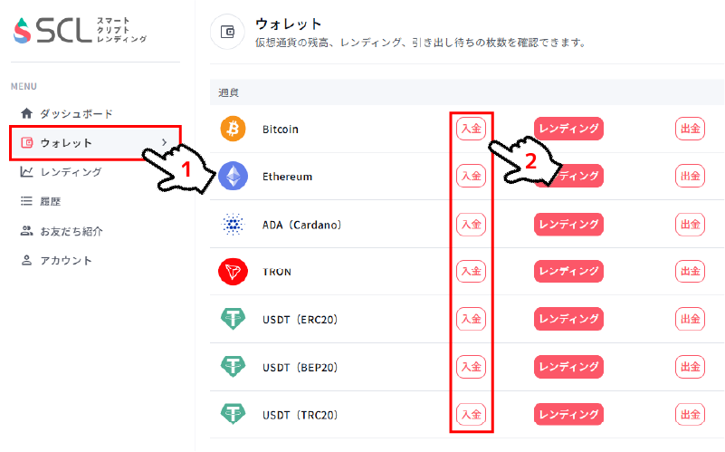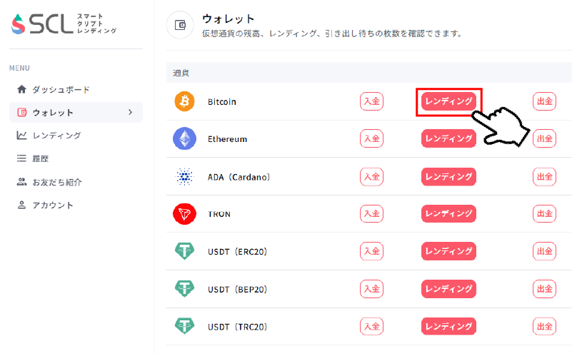 入金が完了したら、再びSCL側に戻り、ウォレットからレンディングを開始しましょう。