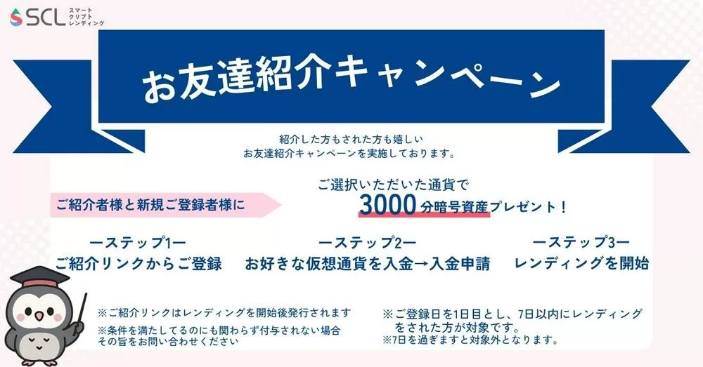 今回は、仮想通貨レンディングサービス「スマートクリプトレンディング」について紹介しました。若干のリスクはありますが、紹介特典の3000円を貰うだけでも爆益ですし、ポイ活勢、投資家勢はいかない理由は無しだと思います!!