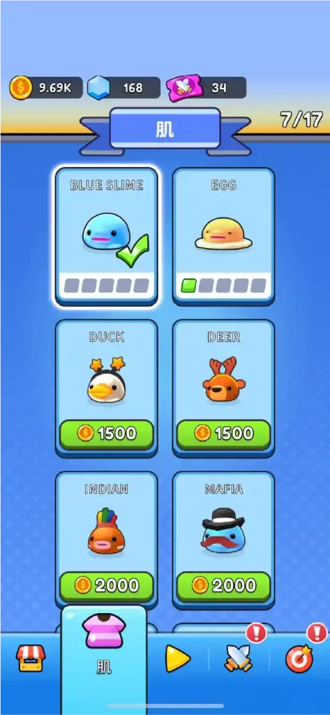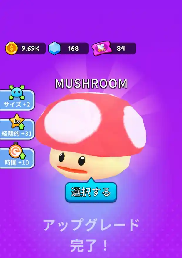恐らく途中で「MASHROOM」のスキンが解放されると思います。このスキンを最後まで使っていきますので、GETした段階からコインの優先順位をスキン強化>ステータス強化に切り替えましょう。