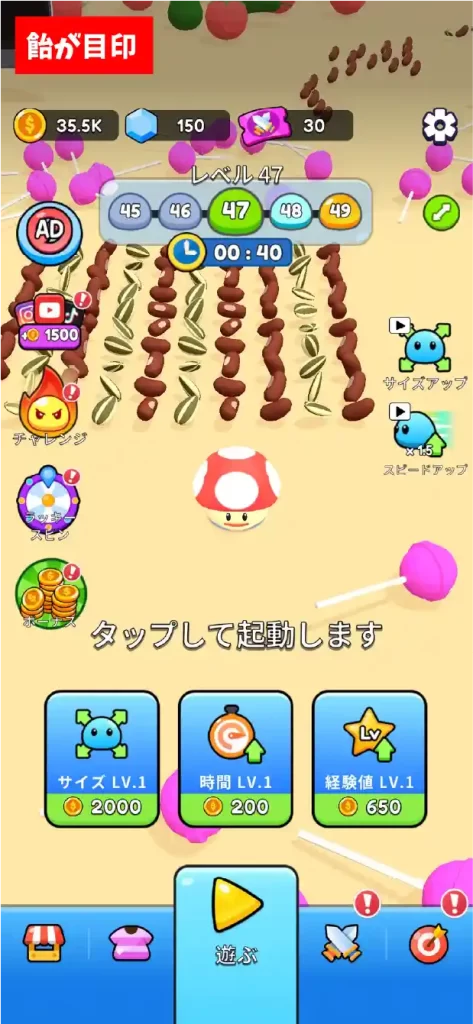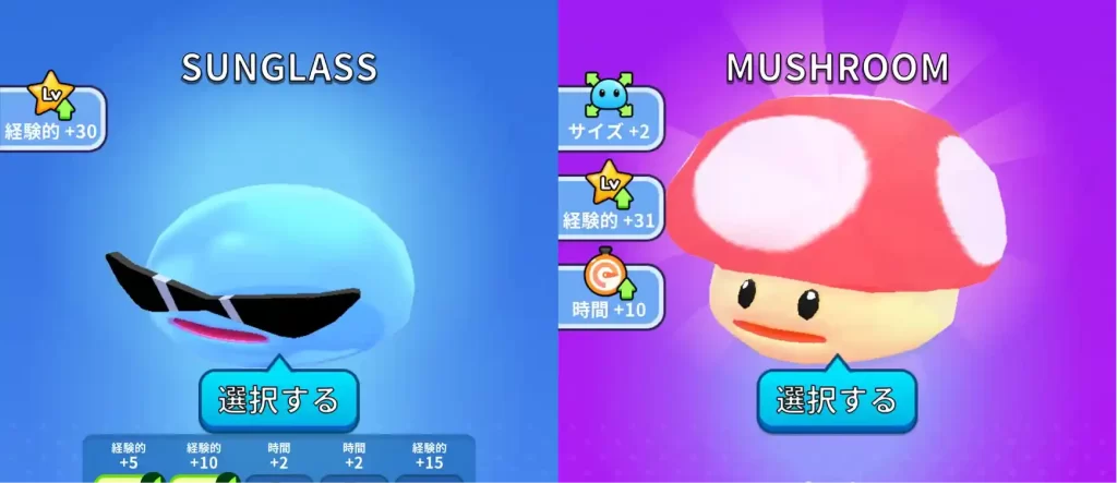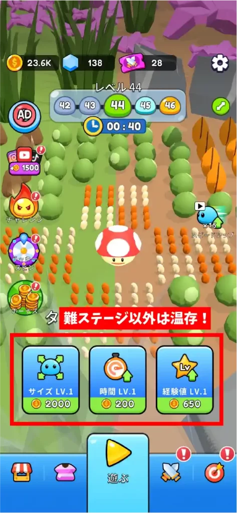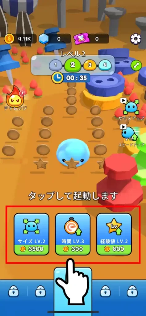 ステージ開始前に、「サイズ」「時間」「経験値」の三つのステータスを先ほどのコインを使ってあげることができます。このステータスは同じステージ内ではたとえボスに負けたとしても引き継ぐことを覚えておきましょう。