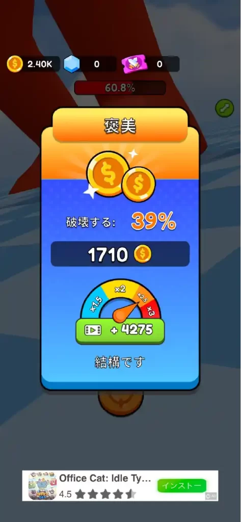使うコインが少ないのでボス戦後のコイン広告も一回時短しましょう。ただし、後述する難ステージの前はボス戦後のコインUPを行いましょう。