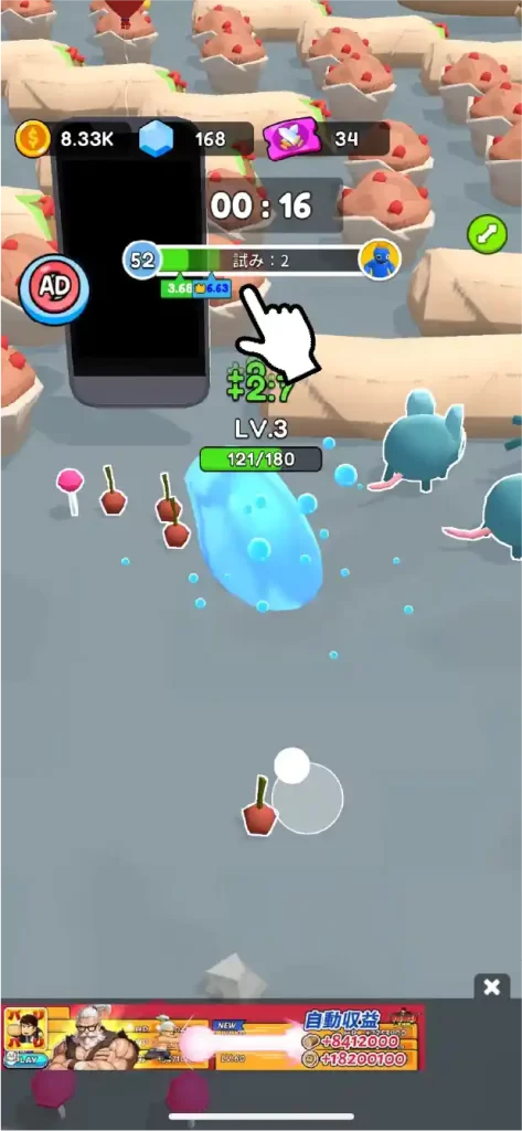 スーパースライム:イートホールはあらゆるところで動画広告を見ることでユーザーに何かしらの恩恵をもたらすような設計になっています。今回の最速クリアは、この広告をなるべく見ないでクリアするのが肝になります。